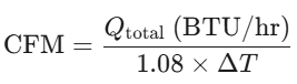 The constant 1.08 is a product of the density of standard air (~0.075 lb/ft³), the specific heat of air (~0.24 BTU/lb·°F), and 60 minutes/hour.