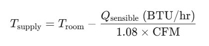 - Reality Check: This formula calculates the temperature of the air leaving the coil. In large buildings, duct runs from a rooftop AHU to a ground-floor zone can be hundreds of feet long. Even with good insulation, duct heat gain through unconditioned plenums can raise the supply air temperature by 1–2 °C (2–4 °F) by the time it reaches the diffuser. This often overlooked factor can be the difference between meeting the load and falling just short.